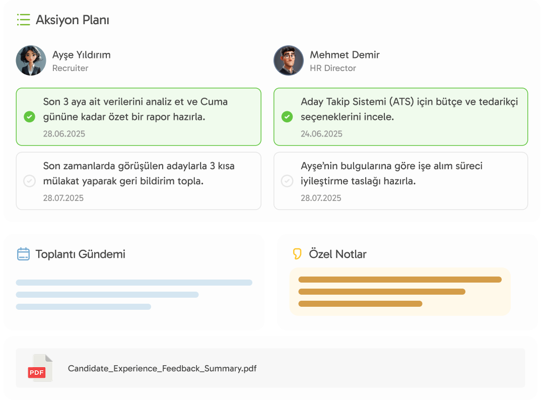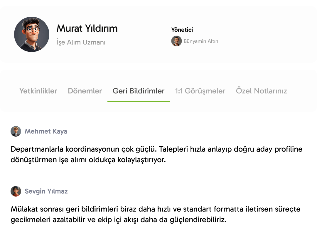 Böylece “konuştuk bitti” değil, geriye dönüp bakılabilen, takibi yapılabilen gelişim diyalogları oluşur; hem çalışan hem yönetici için net bir yol haritası çıkar.
