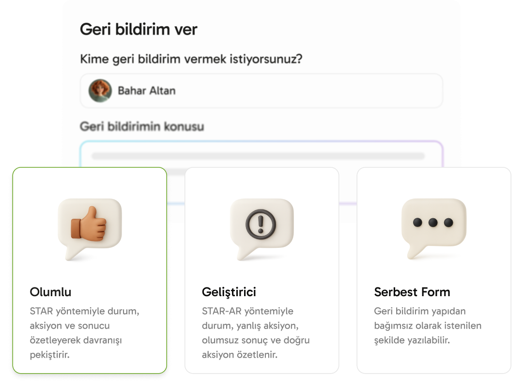 Çalışanlar ve yöneticiler, yapılandırılmış geri bildirim kartları üzerinden somut, davranış odaklı ve kaybolmayan geri bildirimler paylaşır.