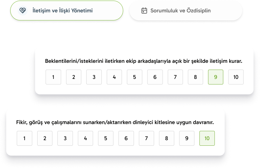 İhtiyaca göre 90°, 180°, 270° veya tam 360° kurgular kurun. Yönetici, ekip arkadaşı, ast, iç müşteri ve/ya istenirse dış müşteri değerlendirmelerini tek akışta toplayarak çok boyutlu bir bakış elde edin.