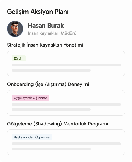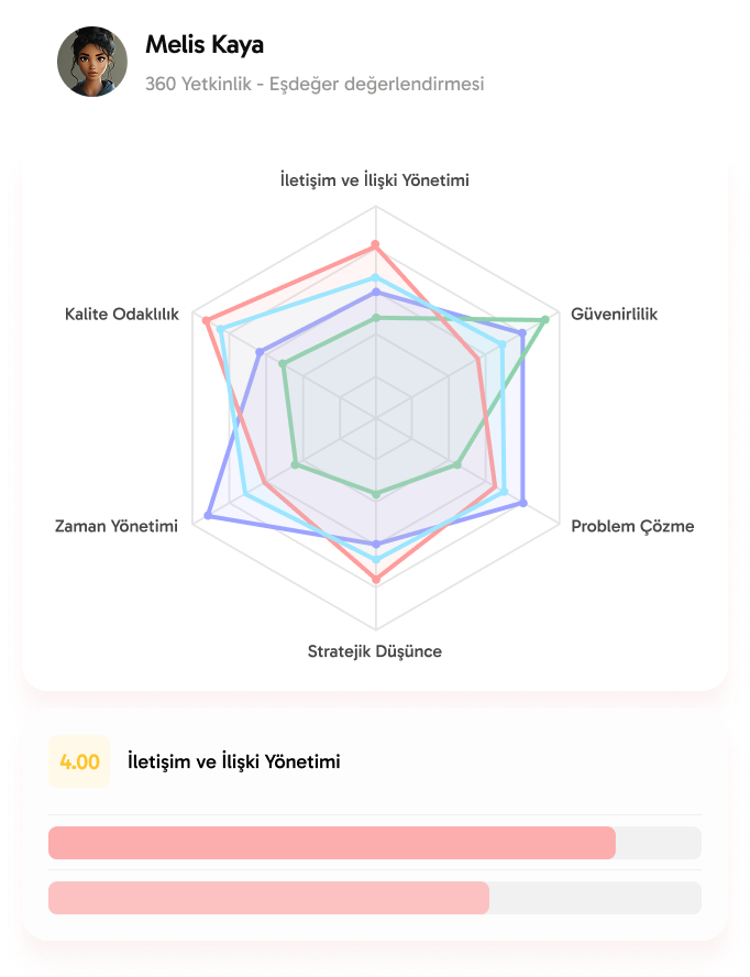 360° değerlendirme, 1:1 ve geri bildirim akışlarınızı tek platformda toplayın; yetkinlik verisini net raporlarla görüp gerçek gelişim planlarına dönüştürün.